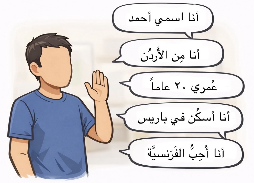Play Pause أنا اسمي أحمدJe m’appelle Ahmadأنا مِن الأُردُنJe suis de Jordanieعُمري ۲۰ عاماًJ’ai 20 ansأنا أسكُن في باريسJ’habite à Parisأنا أُحِبُّ الفَرَنسيَّةJ’aime le français
